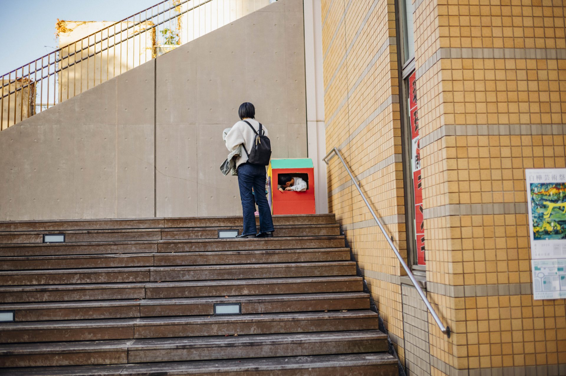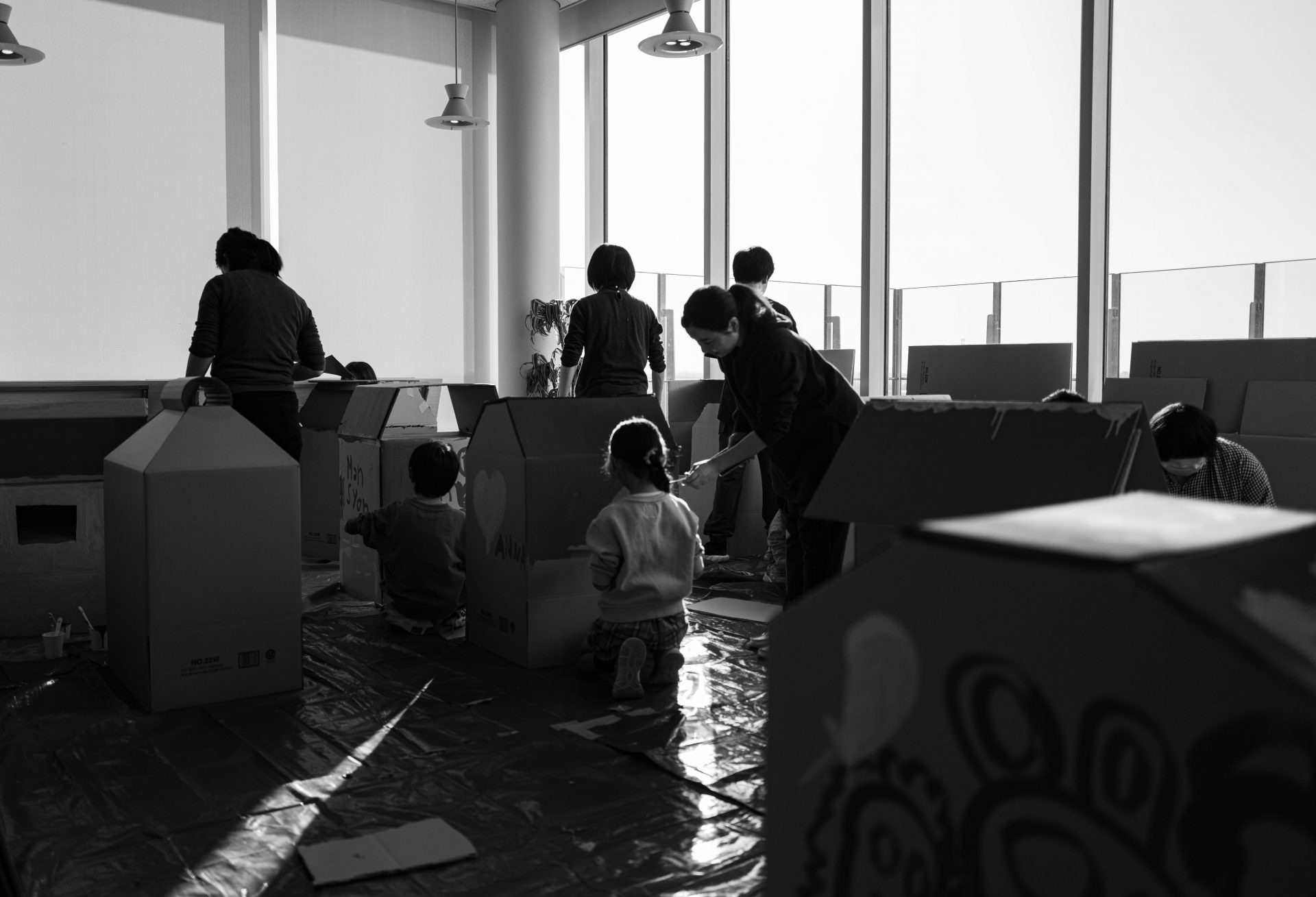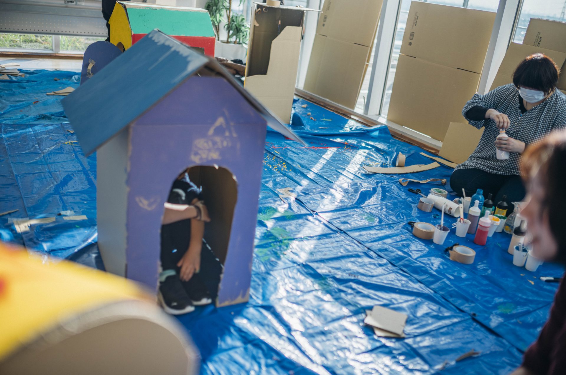 中澤:当日は、我孫子駅前にある「けやきプラザ」(千葉県福祉ふれあいプラザ)の最上階で、段ボールハウスを作るっていう、ワークショップも開いてくれたよね。周りがガラスの窓で、我孫子の街が見える部屋だった。僕も写真を撮りに行ったけど、我孫子の街を背景に、小学生たちが家を作ってるっていう風景がすごく素敵だった。家の中にも自由に絵を描いていて、子どもたちが自分だけの家を作っていく様子が、まるで我孫子の街を創ってるみたいだった。